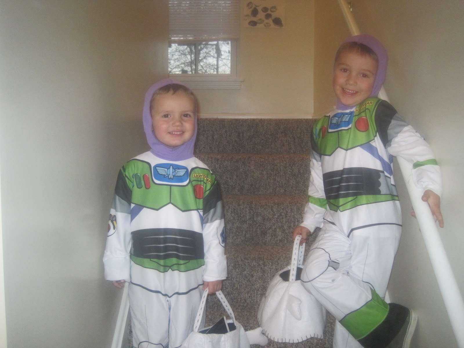 We had two Buzz Light Years at our house this past Halloween weekend. Because of the home football game in our town, trick-or-treating was done on Thursday night, the boys' preschool Halloween party was on Friday morning, the ward trunk-or-treat was on Friday night, and Saturday was carve a jack-o-lantern/ color all over your pumpkin day. We spent a lot of time with Buzz 1 and Buzz 2 last weekend!